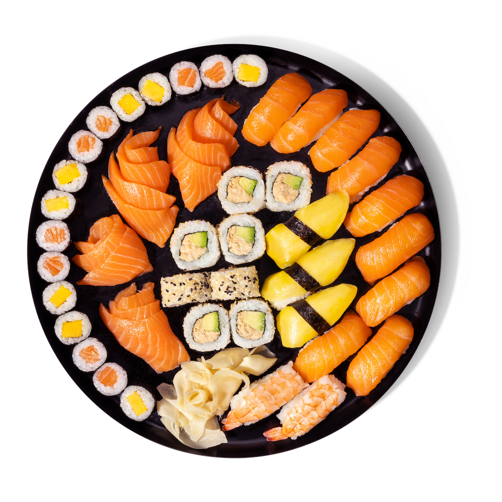 Sushi: 16x Maki (8x Lachs, 8x Mango); 14xSashimi Lachs; 14x Nigiri (9x Lachs, 3x Mango, 2xGarnele); 8x California mit Lachsfüllung und Gurke.